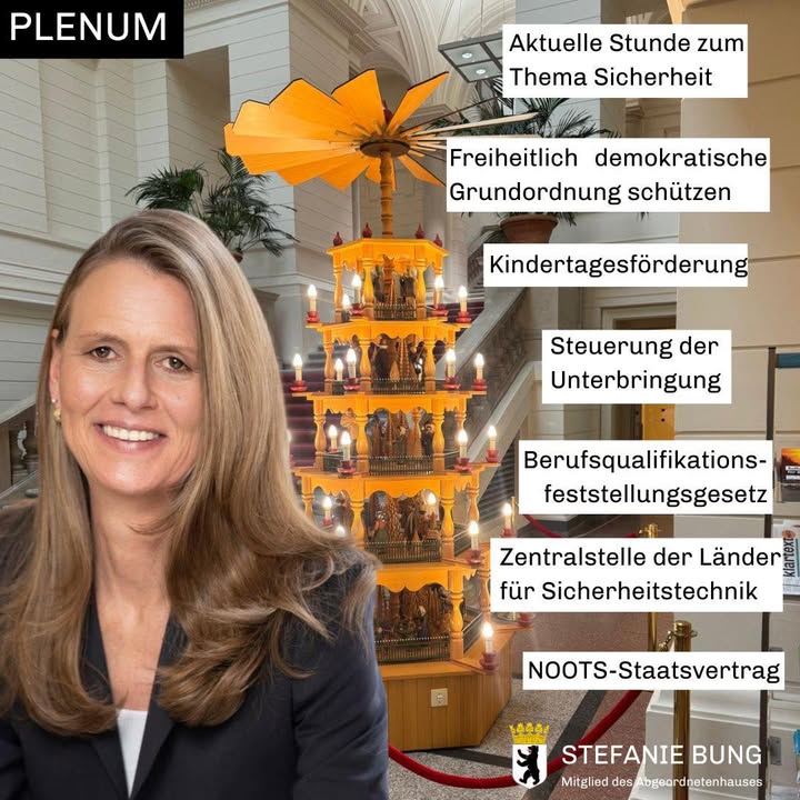🏛️ Vorletzte Plenarsitzung im Abgeordnetenhaus in diesem Jahr.🔎 Thema der Aktuellen Stunde: Sicherheit für Berlin.Wir debattieren den Gesetzentwurf zur Reform des Berliner Polizei- und Ordnungsrechts 🚓 sowie zur geplanten Änderung des Gesetzes zu Artikel 29 unserer Verfassung.⚖️ Im Mittelpunkt steht heute u. a. unser Antrag zum Schutz unserer freiheitlich demokratischen Grundordnung.Gegen Verfassungsfeinde jedweder Richtung ? rechts, links, islamistisch ? müssen wir konsequent vorgehen. Entgegen anderslautender Darstellungen handelt sich dabei keinesfalls um ein AfD-Verbotsverfahren. Mit unserem Antrag stellen wir vielmehr klar, welche Voraussetzungen für eine Bundesratsinitiative zur Einleitung eines Verbotsverfahrens extremistischer Vereinigungen und Parteien vorliegen müssen. Ein Parteiverbot darf niemals politisch motiviert sein. Zuständig sind allein die unabhängigen Institutionen unseres Rechtsstaats ? nicht wechselnde politische Mehrheiten.📋 Zudem auf der Tagesordnung:? Gesetz zur Änderung des Kindertagesförderungsgesetzes 👶? Gesetz zur Umsetzung der gesamtstädtischen Steuerung der Unterbringung 🗣️ In zweiter Lesung beraten wir u. a.:? Änderung des Berufsqualifikationsfeststellungsgesetzes? Änderung des Abkommens über die Zentralstelle der Länder für Sicherheitstechnik 🔐? Gesetz zum NOOTS-Staatsvertrag 🚨#Abgeordnetenhaus #Berlin #Sicherheit #Rechtsstaat #Demokratie #Plenum #Verfassung #InnereSicherheit #Kita #NOOTS #Bundesrat #Politik #BerlinPolitik #CDU #CDUFraktionBerlin #charlottenburgwilmersdorf #stefaniebung