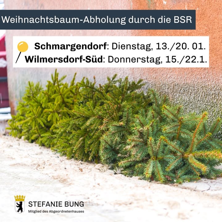 Tschüss, Weihnachtsbaum! 🎄Wie in jedem Jahr sammelt die BSR holt im Januar wieder die ausgedienten Bäume ein. 🗓 Für jeden Stadtteil gibt es zwei Termine:👉In Schmargendorf am Dienstag, 13. und 20. Januar👉in Wilmersdorf-Süd am Donnerstag, 15. und 22.Januar So funktioniert?s:✔ Baum komplett abgeschmückt & unverpackt am Straßenrand bereitlegen✔ Am Vorabend oder spätestens bis 6 Uhr am Abholtag sichtbar platzieren✔ Nicht in die Biotonne, sondern auf die Straße! 🌱 Die Bäume werden, geschreddert und in Kompostieranlagen oder Biomassekraftwerken sinnvoll verwertet. 📞 Mehr Infos & Termine: www.bsr.de/weihnachten oder ☎️ 030 7592-4900#BSR #weihnachtsbaumabholung #berlin #wilmersdorf #schmargendorf #stefaniebung