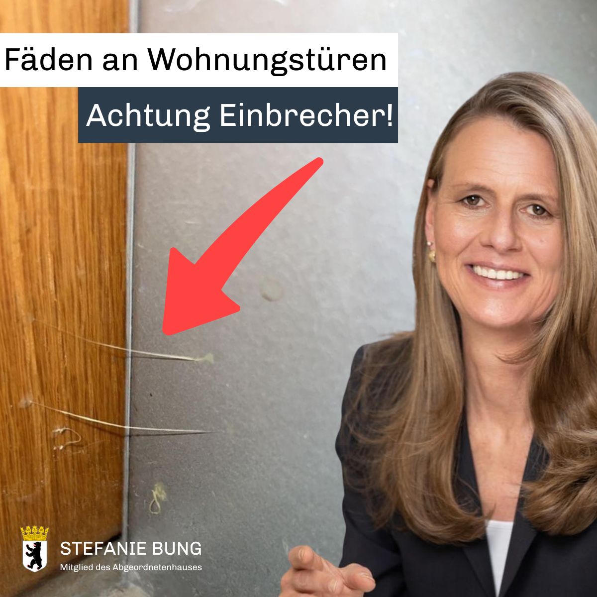 mehr⚠️ Fäden an Wohnungstüren ? Achtung Einbrecher❗ Im Berliner Westen sind aktuell wieder Einbrecher unterwegs, die Wohnungen gezielt ausspähen. Täter kleben dünne, kaum sichtbare Klebefäden zwischen Wohnungstür und Rahmen, um zu testen, ob Bewohner im Urlaub sind. Bleibt der Faden unbeschädigt, denken Kriminelle die Wohnung sei leer. Diese Fälle gibt es berlinweit bereits seit Ende 2022. Immer wieder häufen sich Meldungen aus verschiedenen Kiezen. Jetzt haben mir Freunde aus Lichterfelde ein Foto geschickt ? auch dort wurden solche Fäden entdeckt. 👉 Mein dringender Appell: * Schauen Sie genau hin ? die Fäden sind oft nur mit einer Taschenlampe erkennbar 🔦 * Informieren Sie Nachbarn und die Hausverwaltung 🤝 * Wenn Sie etwas entdecken: entfernen, im Haus prüfen und der Polizei melden 🚔 📍 Für Schmargendorf und Wilmersdorf-Süd ist der Polizeiabschnitt 26 (Rudolstädter Str. 11) zuständig. 📞 Telefon: 030 4664-226700 🚨 In dringenden Fällen: Notruf 110 #Berlin #Einbruchschutz #Warnung #Nachbarschaft #Sicherheit #CDU #Wilmersdorf #Schmargendorf #stefaniebung