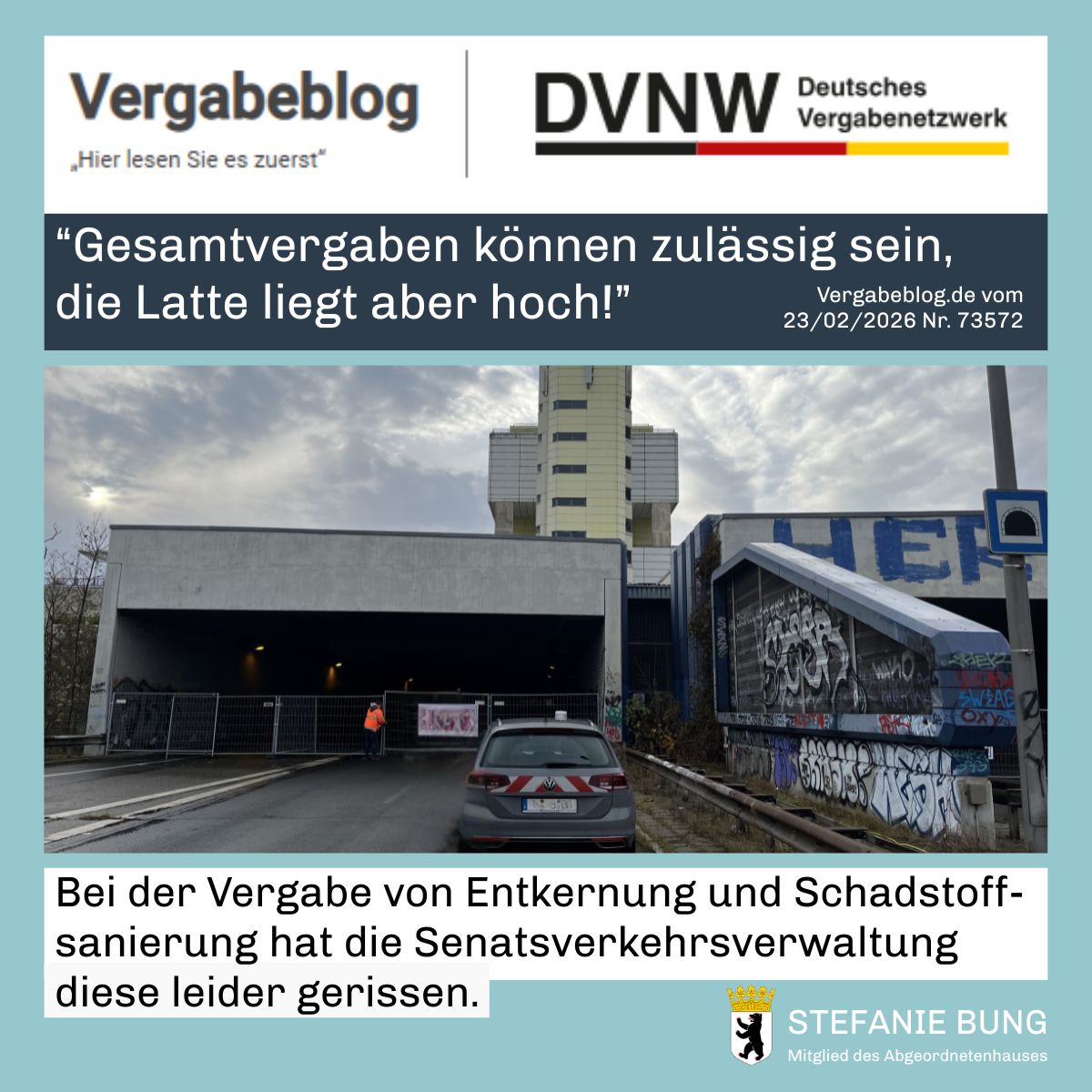Gemeinsam mit der CDU-Fraktion hatte ich mich für die Sanierung und baldige Wiedereröffnung des Schlangenbader Tunnels stark gemacht. Die entsprechenden Gelder wurden im Haushaltsplan hinterlegt. Losgehen sollte es mit der Entkernung und Schadstoffsanierung ?.Jetzt hat das Kammergericht deutlich gemacht: Bei der Vergabe gilt die Losvergabe als Regelfall ⚖️. Gesamt- bzw. Paketvergaben sind nur im eng begrenzten Ausnahmefall zulässig ? und müssen vorab sehr konkret dokumentiert sein 📝. Das war hier nicht der Fall, entschied das Kammergericht. Dieser Vergabefehler verzögert den Sanierungsbeginn nun massiv.Ich erwarte von der Senatsverkehrsverwaltung, dass die Vergabe neu aufgesetzt, sauber begründet und zügig umgesetzt wird 🚦. Für die Anwohnerinnen und Anwohner ist die derzeitige Situation nicht tragbar.👉Details zum Urteil des Kammergerichts finden Sie im Vergabeblog vom 23.02.2026 (Nr. 73572):https://vergabeblog.de/2026-02-23/wann-sind-gesamtvergaben-bei-komplexen-baumassnahmen-zulaessig/#schlangenbadertunnel #berlin #verkehr #infrastrukturr #vergaberecht #CDUFraktionBerlin #CharlottenburgWilmersdorf #wilmersdorf #schmargendorf #stefaniebung