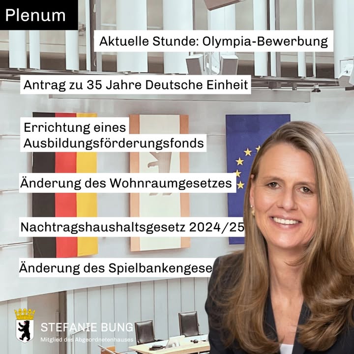 mehr📍 Heute im Plenum des Abgeordnetenhauses von Berlin:🕐 Aktuelle Stunde ? Olympia-Bewerbung 🏅Eine Olympia-Bewerbung bringt Berlin voran: Sie erzeugt neue Arbeitsplätze, stärkt Wirtschaft & Tourismus und ermöglicht moderne, nachhaltige Infrastruktur. Gleichzeitig fördert sie Gemeinschaft und sportliche Begeisterung ? ein Gewinn für die ganze Stadt.🇩🇪 35 Jahre Deutsche Einheit ? Dringlicher Antrag von CDU/SPDWir erinnern an den 3. Oktober 1990 ? den Tag der deutschen Wiedervereinigung ? und wollen mit dem Antrag dieses Jubiläum würdigen. Wir bekennen uns zu dem Ziel, die unterschiedlichen Lebensrealitäten im Osten und Westen Deutschland weiter zu angleichen.🎓 Errichtung eines Ausbildungsförderungsfonds In Berlin gibt es seit Jahren zu wenige betriebliche Ausbildungsplätze. Der Fonds soll helfen, dieses Ungleichgewicht zu beseitigen und mehr jungen Menschen den Einstieg in eine gute Ausbildung und berufliche Zukunft zu ermöglichen. 💼✨📏 2. Lesung ? Weitere Gesetzesänderungen:- Vermessungswesen: Digitalisierung & effizientere Verfahren für eine moderne Verwaltung- Wohnraumgesetz: Mehr Fairness beim Zugang zu Wohnraum, klare Standards und Schutz für Mieterinnen und Mieter.- Lehrkräftebildungsgesetz & weitere Regelungen: Höhere Qualität und Attraktivität im Lehrerberuf, bessere Ausbildung- 4. Nachtragshaushaltsgesetz 2024/25: Solide Finanzen & Verantwortung für Berlin 💶🎰 1. Lesung ? Änderung des Spielbankengesetzes:Ziel ist mehr Transparenz, klare Regeln und Einnahmen, die Berlin zugutekommen. #abgeordnetenhaus #agh #plenum #cdufraktionberlin #politikfürberlin #zukunftgestalten #charlottenburgwilmersdorf #schmargendorf #stefaniebung