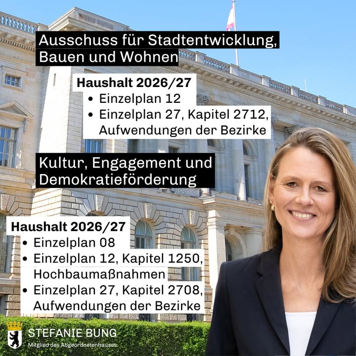 🏛️Im Abgeordnetenhaus tagen heute der Ausschuss für 🏗️ Stadtentwicklung, Bauen und Wohnen sowie der Ausschuss für 🎭 Kultur, Engagement und Demokratieförderung. Im Mittelpunkt steht beide Male der Haushaltsplan für 2026 und 2027.➡️ Stadtentwicklungsausschuss 🏗️:In 2. Lesung beraten wir 🔸 Einzelplan 12 🔸 Einzelplan 27, Kapitel 2712: Aufwendungen der Bezirke im Bereich Stadtentwicklung, Bauen und Wohnen➡️ Kulturausschuss 🎭:Ebenfalls in 2. Lesung beraten wir🔸 Einzelplan 08🔸 Einzelplan 12 Kapitel, 1250: Hochbaumaßnahmen der Senatsverwaltung für Kultur und Gesellschaftlichen Zusammenhalt 🔸 Einzelplan 27, Kapitel 2708 Aufwendungen der Bezirke für Kultur und Gesellschaftlicher #agh #Abgeordnetenhaus #Ausschuss #Berlin #CDU #cduberlin #CDUFraktionBerlin #haushalt202627 #Haushaltsberatungen #stadtentwicklung #Bauen #wohnen #kultur #demokratieförderung #gesellschaftlicherzusammenhalt #charlottenburgwilmersdorf #wilmersdorf #schmargendorf #stefaniebung