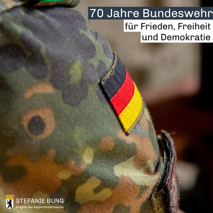 mehrAm 12. November 1955 begann ein neues Kapitel deutscher Geschichte ? eine Armee im Dienst der Demokratie, fest eingebettet in die NATO, der die Bundesrepublik bereits einige Monate zuvor beigetreten war. 🇩🇪Unsere Soldatinnen und Soldaten leisten nicht nur ihren Dienst an der Waffe, sondern helfen auch bei Flut 🌊, Feuer 🔥 und Pandemie 🏥 ? immer, wenn unser Land sie braucht.Der russische Angriffskrieg auf die Ukraine 2022 rückte den zentralen Auftrag der Bundeswehr wieder in den Mittelpunkt. Er hat uns vor Augen geführt:➡️ Sicherheit ist keine Selbstverständlichkeit.Frieden, Freiheit und Demokratie brauchen Wehrhaftigkeit. Beim feierlichen Gelöbnis heute zwischen Kanzleramt und Paul-Löbe-Haus übernehmen junge Menschen Verantwortung für Recht und Freiheit.Als Fördermitglied im Reservistenverband sage ich: Wir brauchen Respekt, Unterstützung ? und eine ehrliche Diskussion über die Wehrpflicht. 🕊️Danke an alle, die dienen. 🙏#Bundeswehr70 #Gelöbnis #Reservisten #CDU #Berlin #Freiheit #Wehrhaftigkeit #CDUBerlin #CDUFraktionBerlin #CharlottenburgWilmersdorf #Schmargendorf #stefaniebung