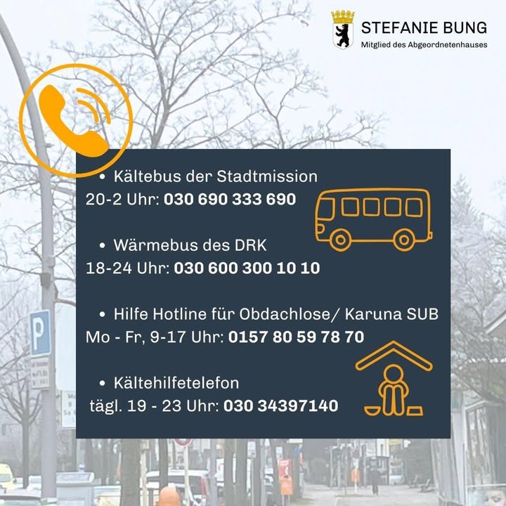 ❄️ Es ist kalt geworden ?für Menschen ohne ein warmes Zuhause wird jede Stunde draußen zu einer echten Herausforderung.Seit Oktober hat die Berliner Kältehilfe ihre Notübernachtungen, Nachtcafés und Suppenküchen geöffnet. Wenn Sie draußen jemanden sehen, der kraftlos wirkt oder offensichtlich friert ? bitte zögern Sie nicht zu helfen und rufen Sie an:🚐 Kältebus der Berliner Stadtmission📞 030 690 333 690🕗 täglich Nov?März, 20?02 Uhr🔥 Wärmebus des DRK-Landesverbandes📞 030 600 300 10 10 täglich Nov?März, 18?24 Uhr🚐 Obdachbus DRK-Südwest (nur Steglitz-Zehlendorf)📞 0157 58 09 49 52🕚 täglich 11?22 Uhr🤝 Hilfe-Hotline für obdachlose Menschen / Karuna SUB📞 0157 80 59 78 70🕘 Mo?Fr, 9?17 Uhr📞 Kältehilfetelefon030 343 97 140🕖 täglich 19?23 Uhr👉 Details zu diesen und weiteren Angeboten finden Sie unter www. kaeltehilfe-berlin.de . #ka?ltetelefon #kältehilfe #berlin #cdu #cduberlin #CDUFraktionBerlin #charlottenburgwilmersdorf #schmargendorf #stefaniebung